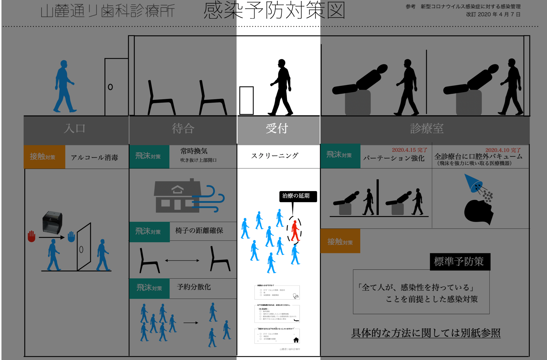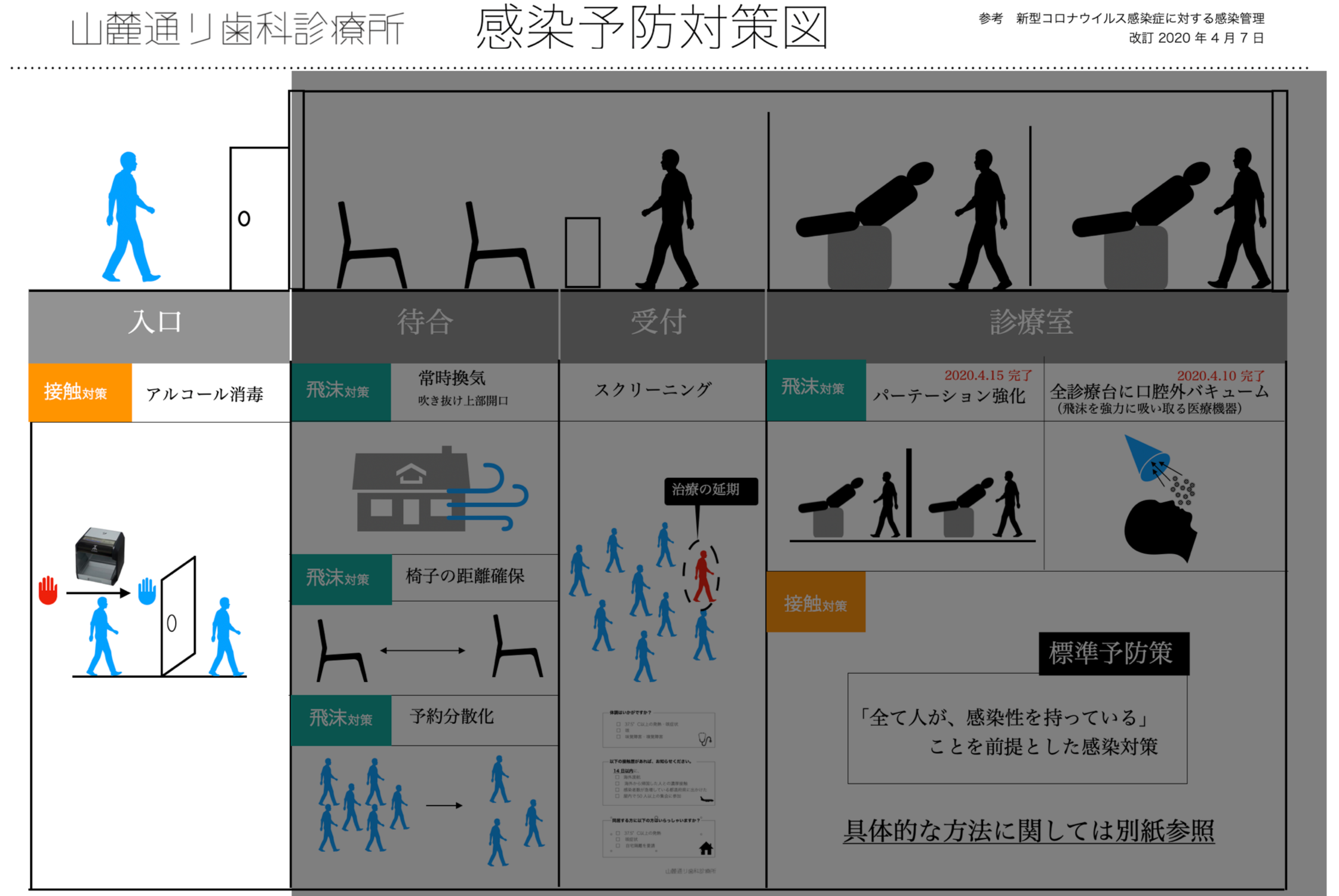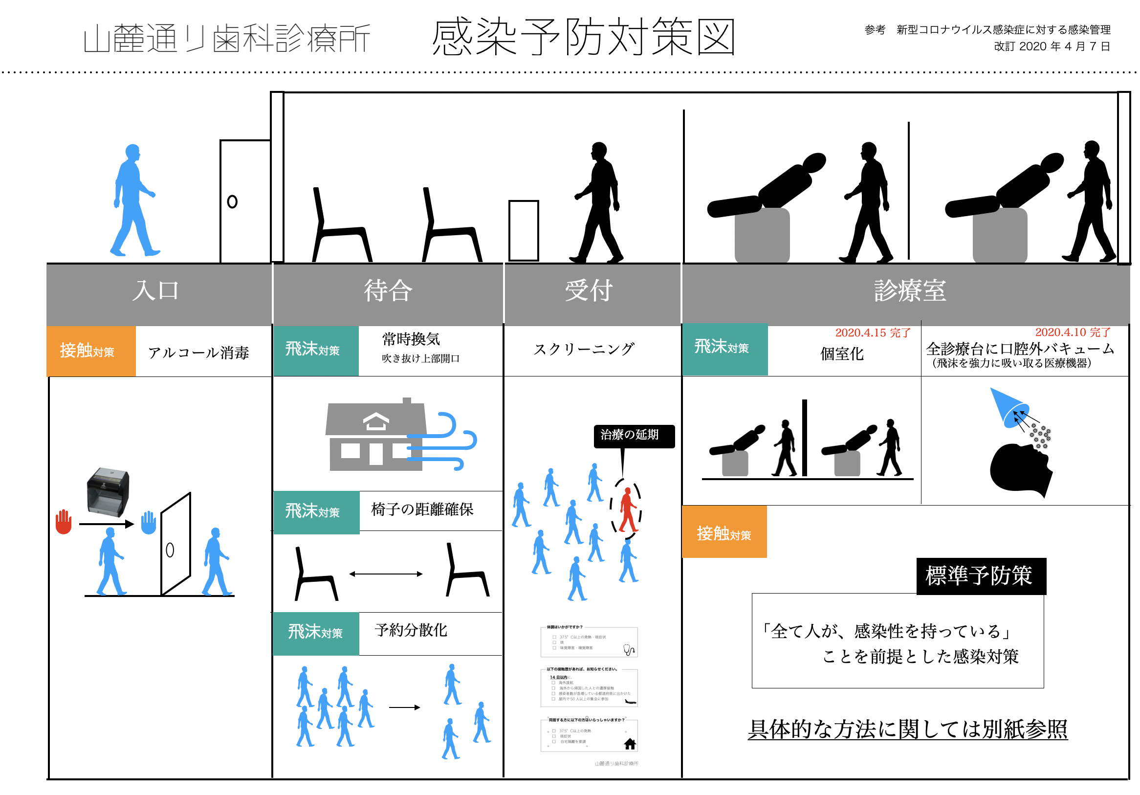 新型コロナウィルス感染拡大に伴い、当院では行政の文書に基づき随時対応を改善しております。様々な感染対策を追加してまいりました。ウィルスの感染経路の特性が徐々にわかってきたために、全体像が整理できるようになりました。