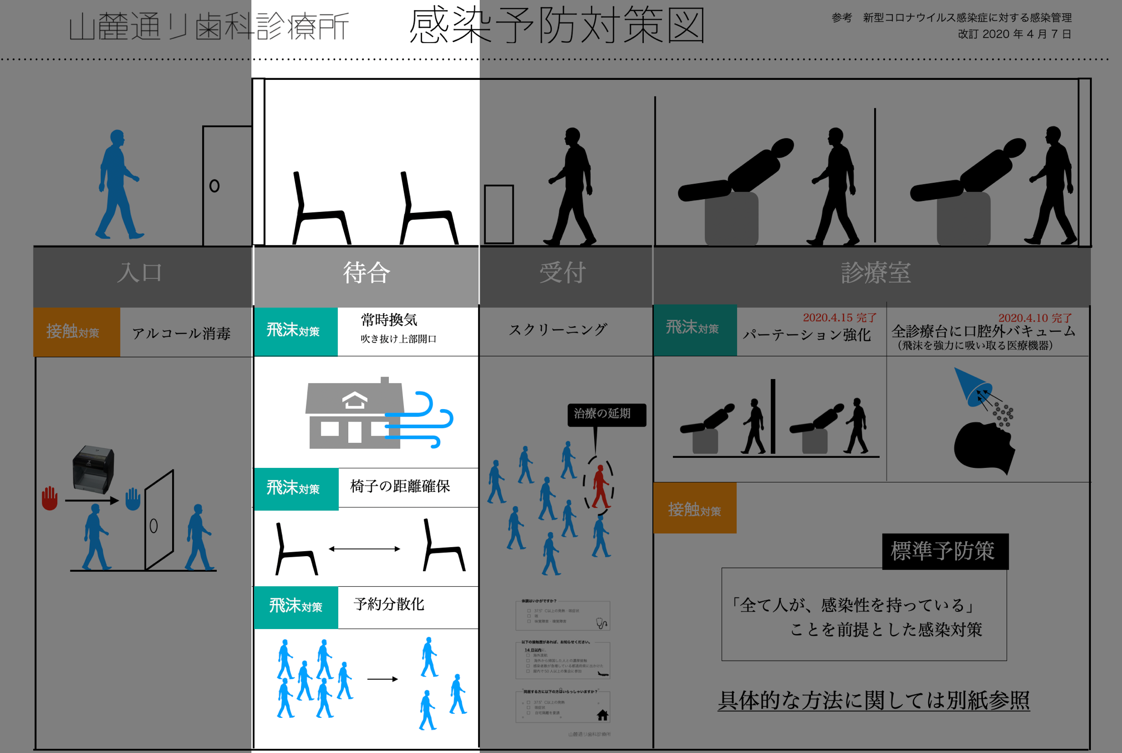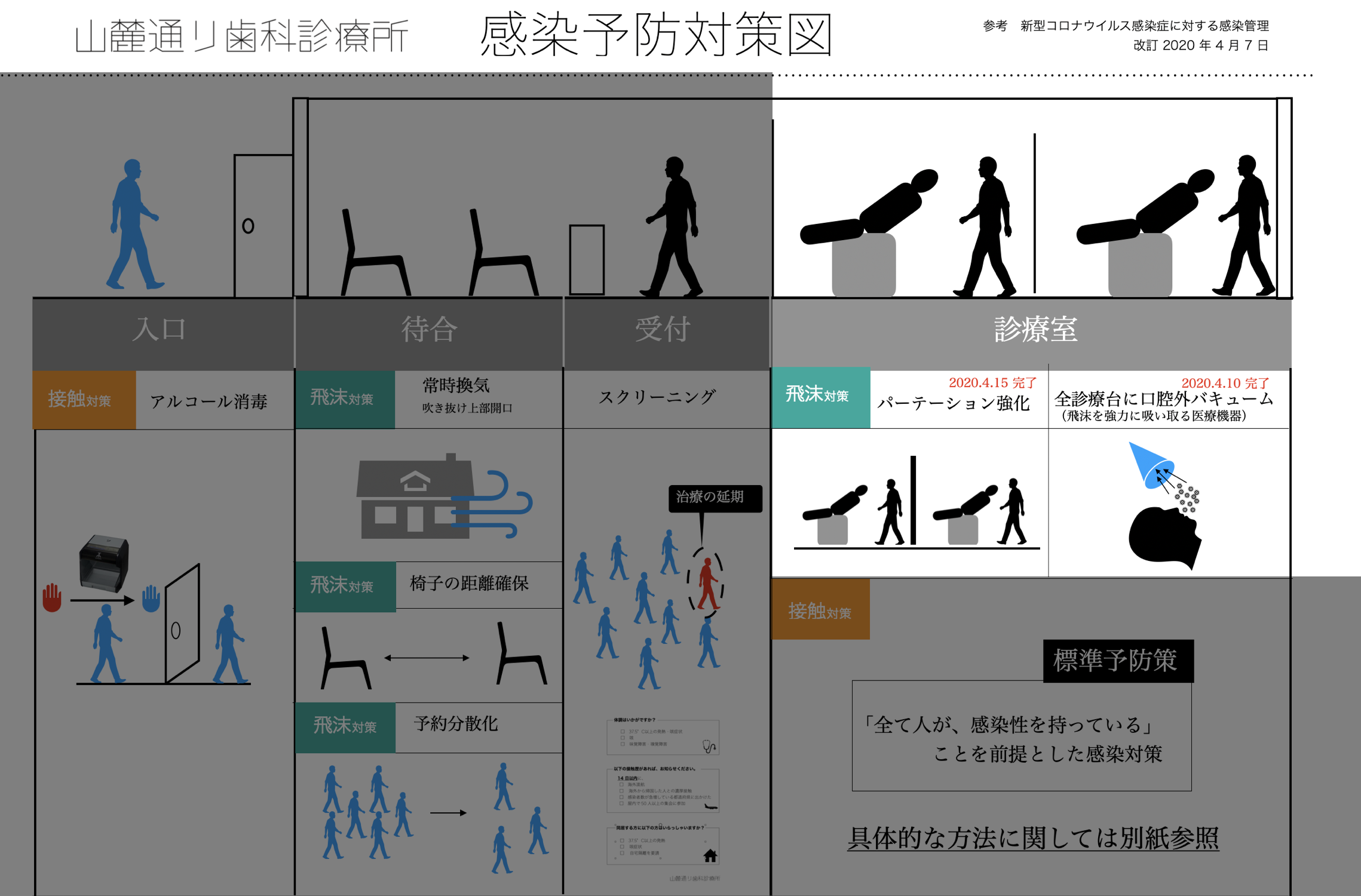 新型コロナウィルス感染拡大に伴い、当院では行政の文書に基づき随時対応を改善しております。様々な感染対策を追加してまいりました。ウィルスの感染経路の特性が徐々にわかってきたために、全体像が整理できるようになりました。